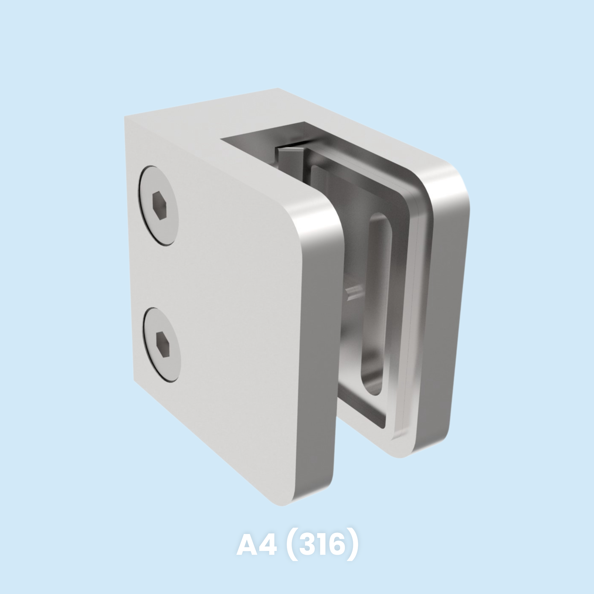 Inox držač stakla na kvadratnom stupu, Inox A4 – morski, polirano. Uz držač potrebno je naručiti 2 kom gumica za odgovarajuću debljinu stakla!